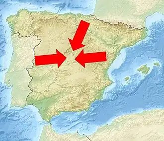 Other scholars do not mention two competitive plans and some refer to a joint plan, produced by Baselga and Cuerda and supervised by Muslera.[46] One historian mentions 2 initial focos of rebellion: Sierra de Aracena (Andalusian units) and Sierra de Gata (units from Leon, Castile and Extremadura).[47] Most prefer to note 3 focos: near Portugal (Extremaduran units commanded by Rafael Villegas and Andalusian ones by Luis Redondo), Maestrazgo (Ricardo Serrador; units from Levante, Catalonia, Aragón) and Navarre (Sanjurjo; units from Cantabria, Burgos, Navarre and Vascongadas).[48] Some single out 4 focos: Sierra de Gata (Villegas), Sierra de Aracena (Redondo), Maestrazgo (Serrador) and Navarre (Sanjurjo).[49]