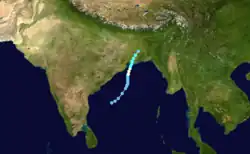 On September 29, two depressions would form from an area of unsettled weather over the Bay of Bengal. While the former one would make landfall in Tharrawaddy and dissipate,[40] the latter one would track northeastwards due to favorable upper-level conditions.[41] As a result, on October 2, it would deepen into a deep depression, developing into a cyclonic storm a few hours later.[41] Further developing, the next day, the system intensified into a severe cyclonic storm,[42] peaking with sustained winds of 75 mph (120 km/h).[43] On 21:00 UTC that same day,[43] the cyclone would make landfall alongside the coast of Odisha.[42] Rapidly weakening once inland, by the next day, the cyclone had weakened into a deep depression, further weakening as it recurved northeastwards.[42] It would finally dissipate over Bangladesh on October 7.[42]