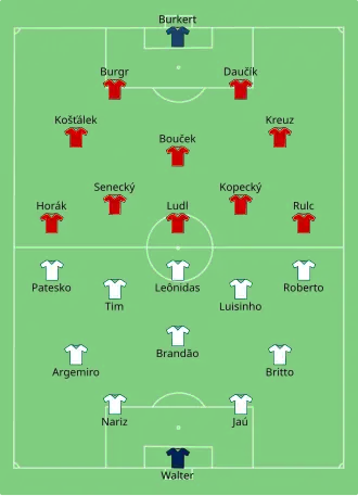 Because of the troubling effect of the first game, which saw several players getting injured or sent off, both teams had to make many changes to their line-ups (nine for Brazil and five for Czechoslovakia). Czechoslovakia took the lead with Vlastimil Kopecký in the 25th minute, but in the second half, stand-in captain Leônidas levelled the score for Brazil. Soon after, the referee disallowed a goal by Karel Senecký, despite the Czechoslovak players stating that it had crossed the line. The European representative continued to attack following that moment, leaving space for the Brazilians to swiftly counter, which debutant Roberto took advantage of to score his nation's second goal.[2]