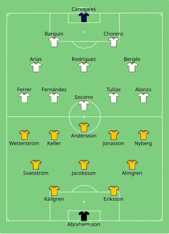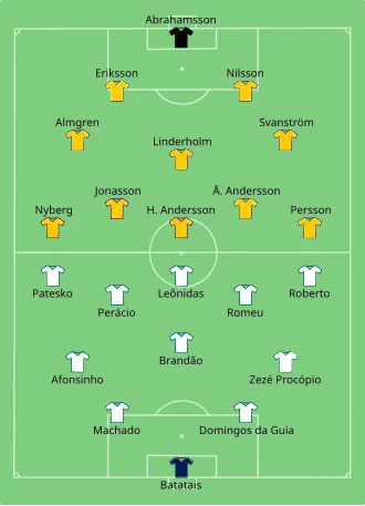 Sweden started on the front foot, taking a double lead inside 38 minutes. In the first half, Brazil looked uninspired until they got one back before half-time. In the second half, Brazil was reinvigorated and pushed for the comeback. In the second half, Leônidas scored twice and even let Patesko kick a penalty that he missed. Perácio secured the victory in the 80th minute.[2]