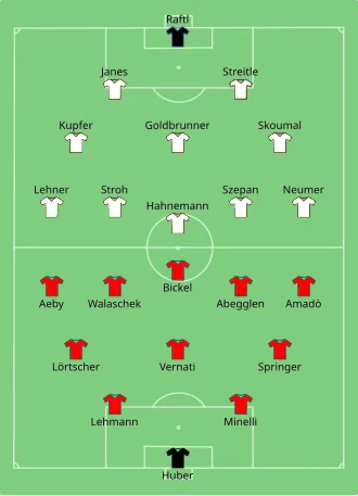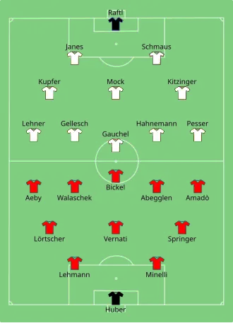 Switzerland adopted a precursor version of the Catenaccio system to try stopping the talented German forwards. Thanks to this tactical system, the Swiss managed to frustrate the Germans despite going behind after a goal from Gauchel. Switzerland drew level with Abegglen after a mistake from Willibald Schmaus. Although the Germans pushed for the win, the game ended with a draw, forcing a replay.[2]