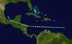 On September 23, a minor area of disturbed weather was observed about 75 mi (121 km) to the northwest of Barbados.[2] It is estimated that it developed into a tropical storm shortly thereafter.[5] Tracking westward, it passed just south of St. Lucia and emerged into the Caribbean Sea. By September 25, the storm had reached hurricane strength.[2] Still intensifying, the storm continued generally westward and reached its peak at Category 4 on the Saffir-Simpson Hurricane Scale.[5] By late September 27, the hurricane was situated near Cape Gracias a Dios, Honduras, and accelerated as it moved across the northernmost stretch of the country. It maintained hurricane intensity despite moving over mountainous terrain. After briefly entering the Gulf of Honduras, it moved ashore again in Belize, with winds of up to 85 mph (137 km/h).[5] Gradually weakening, the storm continued inland and weakened to a tropical storm by September 29. The storm emerged over the Bay of Campeche as a tropical depression and dissipated on September 30 while over water.[2]