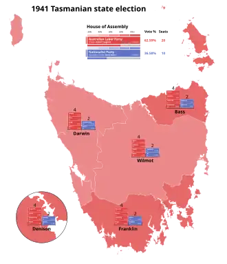 The 1941 Tasmanian state election was held on 13 December 1941 in the Australian state of Tasmania to elect 30 members of the Tasmanian House of Assembly. The election used the Hare-Clark proportional representation system[1] — six members were elected from each of five electorates.