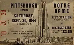 To generate ticket sales for the Notre Dame game, the Sports War Finance Committee offered 50-yard line seats to purchasers of war bonds ($18.75 and up). If one purchased a $10,000 bond (or higher), the fan could choose a seat on the Pitt bench, or a visit to the Notre Dame dressing room after the game.[21]