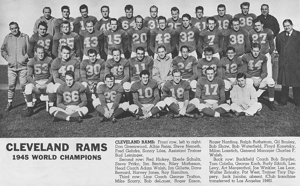 The 1945 Cleveland Rams season was the team's eighth year with the National Football League and the ninth and final season in Cleveland. Led by the brother tandem of head coach Adam Walsh and general manager Chile Walsh, and helmed by future Hall of Fame quarterback Bob Waterfield, the Rams franchise finished 9–1 before winning its first NFL Championship by defeating the Washington Redskins, 15–14, at Cleveland Stadium. Other stars on the team included receiver Jim Benton and back Jim Gillette, who gained more than 100 yards in the title game.