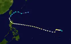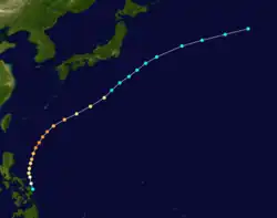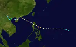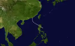 On June 17, Typhoon Dolly formed. It moved northwestward, only to strengthen. After passing by the Philippines, it reached its maximum intensity of 125 mph, a strong major hurricane. It rounded around Taiwan and made landfall on China's shoreline. It dissipated hours after on June 23.