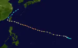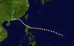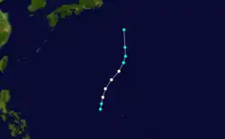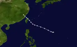 A tropical storm was first noted in weather maps on July 8, near Palau. Moving to the northwest, it strengthened to a minimal typhoon before it hit Formosa as a weakening storm. It then crossed the Formosa Strait, before making another landfall near Xiamen on July 12. It was last noted on the same day.