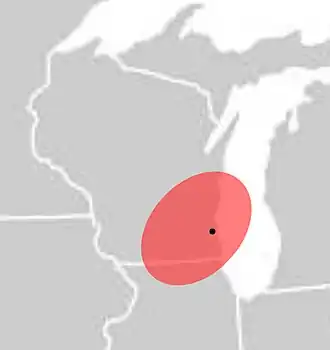 ![]() 1947 Wisconsin earthquake approximate tremor area. The dot shows the location of Milwaukee. | |