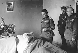 Corporal Georgii Vladimirovich Komarov had taken part in the assault crossing of the Shchara. A veteran of the Russian Civil War, and a member of the Communist Party of the Soviet Union since 1931, he had been drafted into the Red Army at Kuibyshev in February 1943. By this time he was serving as the Party organizer of the 5th Company of the 470th Rifle Regiment. On September 4, Komarov helped lead his company in a breakthrough of German defenses near the Narew River in the area of Grondy. He was seriously wounded, but refused to be evacuated, continuing to inspire his comrades through his personal example. He succumbed to his wounds on October 5, at the age of 48. On March 24, 1945, he was posthumously made a Hero of the Soviet Union.[74]
