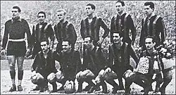 Aldo Olivieri[1] took for him the job of Giulio Cappelli as manager in round eight of the championship. President Masseroni bought defenders Ivano Blason from Triestina and Bruno Padulazzi from Lucchese, being signed too Lennart Skoglund.[2] Arrival of the Swedish player in addition to the attacking line up with Nyers, Lorenzi and topscorer Wilkes,[3] diminished chances of play for striker Amadei whom was transferred out to S.S.C. Napoli.[4] Helped by an amazing campaign with 107 goals scored, the squad competed for the trophy with Milan losing, unexpectedly, the last two away matches of the season. Inter did not manage to surpass its city rivals on the table and lost the league trophy by one single point.