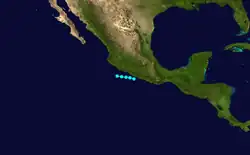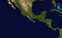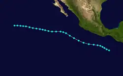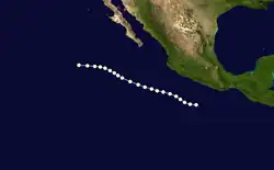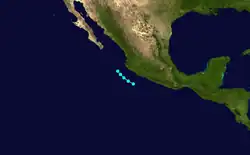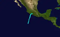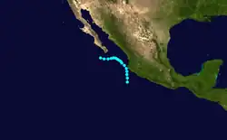 On August 24, a tropical storm was first observed south of Mexico. It paralleled the coastline, and moved northward into Baja California on the 28th. It dissipated the next day,[1] and caused moderate flooding in southern California.
