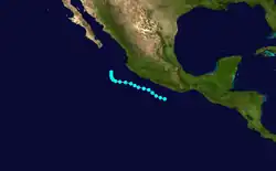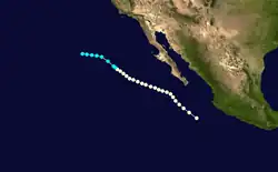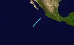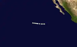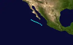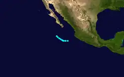 A hurricane developed on September 15 southwest of Baja California and dissipated seven days later.[1] Moisture from Five produced 2 in (51 mm) of rainfall in the deserts and mountains of central and southern California.[2]