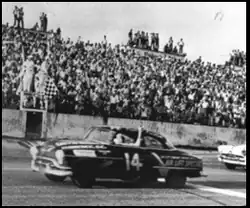 Seven cautions were waved for forty laps in front of 32,400 audience members.[2] The race's speed was 74.512 miles per hour (119.915 km/h) and 88.550 miles per hour (142.507 km/h) as the pole position speed.[2] This race was constantly threatened to be postponed because of rain and was red flagged once because of actual rainfall.[4] It took six hours, forty-two minutes, and thirty-seven seconds for the race to reach its conclusion, making it the longest Southern 500 ever; Fonty Flock was the winner.[2] He would stop on the front straight, climb up on his hood and lead the entire crowd in singing his own version of the classic Southern American song Dixie.[4]