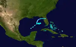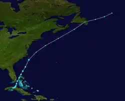 On October 3, a tropical storm developed near the southern coast of Cuba. It moved northwestward, crossing the island before turning to the northeast. Early on October 5, the storm brushed southeastern Florida,[8] producing gusty winds and rainfall. The threat of the storm prompted small craft warnings from the Florida Keys through South Carolina.[33] As it accelerated northeastward, the storm strengthened slightly to maximum sustained winds of 45 mph (75 km/h), before becoming extratropical on October 6. Two days later, the remnants moved over Atlantic Canada with winds of 70 mph (120 km/h),[8] producing flooding rainfall that washed out several roads. The storm caused two deaths after it wrecked a boat in Broad Cove, Nova Scotia.[34] Later, the cyclone passed south of Greenland before dissipating southwest of Iceland on October 10.[8]