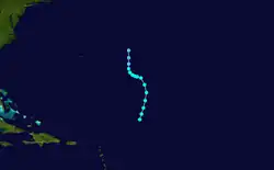 Shortly behind Dolly, another tropical wave spawned a tropical depression over the Lesser Antilles on September 15.[3] As it moved through the region, it produced unsettled conditions across the northeast Caribbean.[24] Edna quickly intensified as it tracked northwestward, attaining hurricane status on September 15 and peak winds of 115 mph (185 km/h) the next day. After peaking, the hurricane turned to the northeast and maintained most of its intensity for a few days.[3] It passed just north of Bermuda early on September 18 with winds of 115 mph (185 km/h), before beginning a steady weakening trend as it accelerated. By September 19, Edna completed the transition into an extratropical cyclone, lasting another day before dissipating west of Ireland.[8]