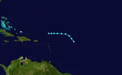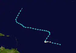 The final tropical cyclone of the season developed on December 7 about 705 mi (1735 km) east-northeast of the Lesser Antilles, from the end of a dissipating cold front. Given the name Irene, the storm moved to the northwest and later to the west. Based on ship observations, it is estimated that Irene intensified to a peak of 65 mph (100 km/h) on December 8, before weakening the next day. Late on December 9, Irene dissipated about 270 mi (435 km) north of the Lesser Antilles.[8][9]
