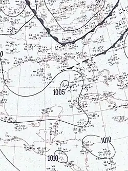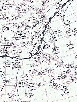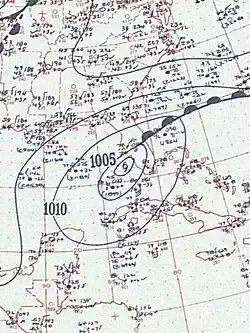 On August 29, a tropical storm developed over southern Florida.[8] While moving through the state, the storm dropped heavy rainfall, reaching 4.67 in (119 mm) at Fort Lauderdale Beach; similar rainfall was observed in the northern Bahamas. Described by one Weather Bureau forecaster as "wide and flat", the storm gradually organized over the western Atlantic Ocean.[20] On August 31, the storm turned to the northwest, with maximum sustained winds of 40 mph (65 km/h). The system weakened to a tropical depression before moving ashore near Savannah, Georgia on September 1. It dissipated that day over land.[8]