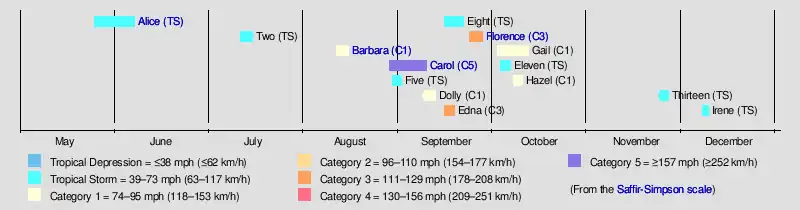 The strongest hurricane of the season was Carol, although by the time it struck Atlantic Canada it was much weaker. Both hurricanes Barbara and Florence struck the United States; the former crossed the Outer Banks and impacted much of the east coast, and Florence struck a sparsely populated region of the Florida Panhandle without causing much damage. Bermuda was threatened by three hurricanes within two weeks. In addition to the hurricanes, Tropical Storm Alice developed in late May and left several fatalities in Cuba. The final hurricane of the season, Hazel, produced additional rainfall in Florida after previous flooding conditions. The season's last tropical storm, Irene, dissipated north of the Lesser Antilles on December 9.