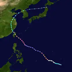 On June 25, Kit formed just south of the Philippines. Over the following days, the storm traverses west, then later northwest, having peak intensity on June 29. Kit later starts decreasing speed on July 1, then made landfall in Taiwan on July 3. The next day, Kit settles in China, curving north. The storm stayed in China over the following days, then made landfall on the Korea peninsula on July 5. The storm later makes landfall in Japan on July 7, then dissipated the following day.[6] Because of the storm, strong winds were recorded in Batanes, with widespread precipitation.[7] Other than rain, Kit destroyed a ship and damaged another.[8]