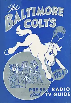 The 1954 Baltimore Colts season was the second season for the team in the National Football League. The Baltimore Colts finished the National Football League's 1954 season with a record of 3 wins and 9 losses and finished sixth in the Western Conference. This was the first season that the Horseshoes appeared on the helmet. For the first two seasons (1954 & 55), the horseshoes were white and they were located on the back of an all blue helmet. In 1956 the color of the helmet change to White while the Horseshoes became blue. It wasn't until 1957 when the Colts received their most famous helmet design that's still in use to this day, a white helmet with a blue stripe down the middle and a blue horseshoe on either side.