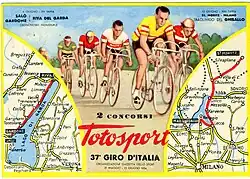 While noting that the Giro had been primarily won by Italian riders, Feuille d'Avis Valaisan felt the teams with Belgians, Spanish, and Swiss teams would have a good chance to rival the Italian squads.[5] Nouvelliste Valasain writer even commented that a coalition of some sort exists between Italian riders against the foreign riders.[4] Girardengo-Eldorado riders Stan Ockers and Rik Van Steenbergen were seen as the best Belgian entrants.[4] Their Raymond Impanis was seen a potential threat, but due to disputes with their team director, his participation was questionable.[4] Heinz Müller was the German Clement team's best chance.[4] The Dutch team Locomotief was thought to be filled with good climbers and rouleurs with the likes of Wim Van Est, Wout Wagtmans, and the Voorting brothers Adrie and Gerrit.[4] The team was expected to do well in the opening team time trial.[4] Spanish Climber Jesus Loroño (Ideor) was seen as a contender in the mountains after his performance at the 1953 Tour de France, where he won as a stage and the Mountains classification.[4] Bernard Ruiz and Francisco Masip were two other Spanish riders to watch.[4] Fritz Schär (Guerra) was seen as a rider who would favor the intermediate sprints classification despite his recent poor performance at the Tour de Romandie.[4] Carlo Clerici (Welter) was thought to have "class and will."[4]