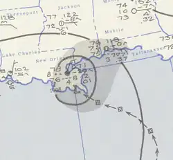 A weak disturbance was first observed near Grand Cayman on August 23.[4] The disturbance moved northeastward into the Gulf of Mexico, where it became a tropical depression late on August 25. Early the next day, the depression intensified into a tropical storm. The tropical storm marginally strengthened further, peaking with maximum sustained winds of 45 mph (72 km/h) by 0000 UTC on August 27. Nearing the Gulf Coast of the United States, the system curved towards the west.[7] The storm maintained its intensity up until landfall in Louisiana near New Orleans about four hours later.[4] Moving inland, it slowly weakened while crossing the Central United States, degenerating to tropical depression strength by August 28 and dissipating over east-central Texas several hours later.[7]