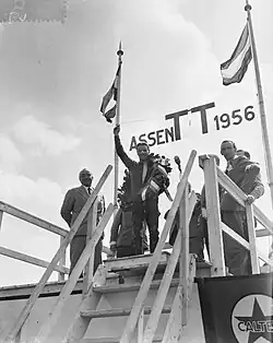 Reigning 500cc champion Geoff Duke had to serve a six months ban at the start of the season for supporting a strike by privateer riders over starting money at the 1955 Dutch TT .[ 1] [ 2]
