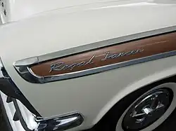 The Royal were the next step up. They used only the V8 engine. Identifying exterior characteristics include Royal script at the trailing edge of the belt-line molding, a pronounced "check-mark" at the rear up-sweep of the fin, chrome Dodge block letters on the front of the hood, chrome Dodge script on the passenger side of the trunk, and hood ornaments as standard equipment. Fin cap inserts were anodized with a horizontally ribbed pattern. Body styles offered were sedan, two-door hardtop (Lancer), and four-door hardtop (Lancer). Lancers were further identified by a lance and shield emblem on each fin.