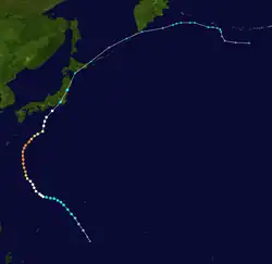 Tropical Storm Alice developed on July 14 in the open western Pacific Ocean. It moved to the northwest and attained typhoon status on the 16th. Alice rapidly intensified on the 19th to a 150-mile-per-hour (240 km/h) super typhoon, and after turning to the northeast it weakened. Alice hit southeastern Japan on the 22nd, and became extratropical on the 24th near the Kamchatka Peninsula.[5]