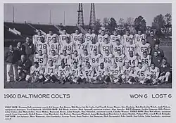 The 1960 Baltimore Colts season was the eighth for the team in the National Football League. The season started well for the Colts going 6–2. The team looked like they would win their third straight championship. Then in a game on Dec. 4th against the Detroit Lions, star running back Alan Ameche tore his Achilles tendon and missed the final two games. The injury ended his career.[1] With Ameche out, the Colts ended the season losing their last three games, for a total of four consecutive losses. Their record was 6 wins and 6 losses. The team went from first to fourth place in the Western Conference. As a result, their two-year reign as NFL champions came to an end.