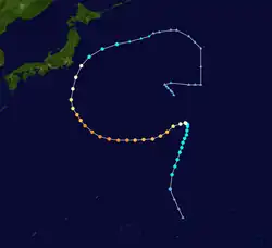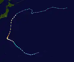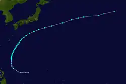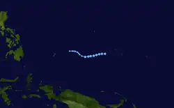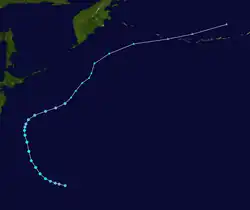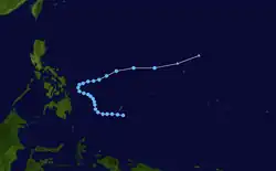 The most unusual tropical cyclone of the year began its life on November 21 in the open Western Pacific. The depression drifted, first to the west, then to the southeast, then back to the west, varying between a tropical depression and an open trough of low pressure. After a northward turn, it strengthened into a tropical storm on the 27th and turned back to the southwest. Ophelia turned to a west drift, and under favorable conditions, intensified into a typhoon on the 29th. It continued to strengthen as it crossed over the Caroline Islands, and became a super typhoon on the 30th. A day later it reached a peak of 155 mph (249 km/h), but a northward turn weakened it to 150 mph (240 km/h). Ophelia remained a Category 4 typhoons until December 4, when it began accelerating to the northeast over unfavorable conditions. After weakening to a tropical storm on the 6th, Ophelia became extratropical over the Northern Pacific Ocean. As an extratropical storm, it persisted until dissipating south of Alaska on the 8th. Ophelia brought heavy rains to the Caroline Islands, killing 2 and injuring 4. Many of the islands were covered in up to 2 feet (0.61 m) of water, and they experienced severe damage from Ophelia's strong winds. The name Ophelia was retired after this storm. Over the course of Ophelia's life, it traveled 5,000 miles.[16]