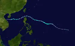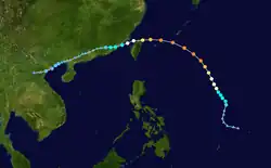 A large circulation over the Western Pacific organized into a tropical depression on October 2. It moved westward, steadily strengthening to a peak of 100 mph (160 km/h). Kit made landfall on the eastern Philippines at that intensity on the 6th and quickly crossed the archipelago. It turned to the northwest over the South China Sea and struck eastern Hainan Island on the 11th. Kit turned to the southwest, and after weakening hit northeastern Vietnam as a minimal tropical storm on the 13th. Kit dissipated shortly thereafter.