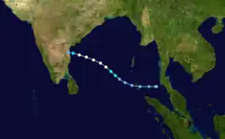After making landfall in Thailand, the system continued westward, then curved to the northeast, probably regathering strength and making landfall near Chittagong in East Pakistan on October 30 before rapidly dissipating.[13]