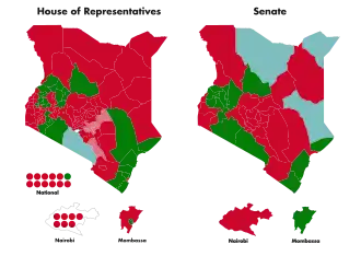 The result was a victory for the Kenya African National Union (KANU), which won 83 of the 124 seats in the House of Representatives and 18 of the 38 seats in the Senate. Five seats in the House and three in the Senate remained unfilled due to a secessionist conflict on the border with Somalia.[1]