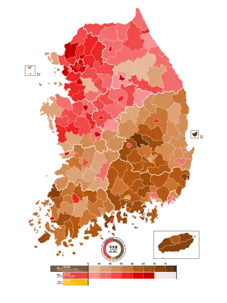 | Jeonnam | 765,712 | (57.2%) | 480,800 | (35.9%) | 51,714 | (3.9%) | 17,312 | (1.3%) | 22,604 | (1.7%) | 1,338,142 | ![]() |
