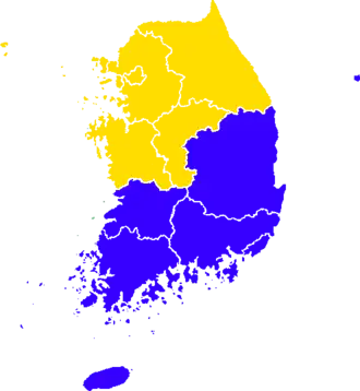 | Gyeongnam | 706,079 | (61.7%) | 341,971 | (29.9%) | 60,645 | (5.3%) | 19,323 | (1.7%) | 26,014 | (2.3%) | 1,144,032 | ![]() |