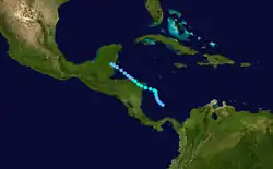 An area of disturbed weather within the ITCZ developed into a tropical depression early on November 5, while located about 135 mi (215 km) north-northwest of Colón, Panama.[3][8]: 187 The depression strengthened slowly, reaching tropical storm status on November 6. Thereafter, it curved westward towards Central America. Early on November 7, the storm made landfall near Puerto Cabezas, Nicaragua, with winds of 70 mph (110 km/h). Several hours later, it weakened to a tropical depression along the north coast of Honduras early on November 8, shortly before re-emerging into the Caribbean. The storm did not re-intensify and made landfall in Belize on November 9. It dissipated early on the following day.[3]