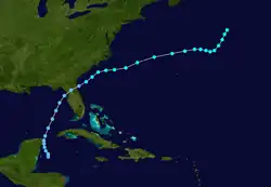 A disturbance that moved out of the Intertropical Convergence Zone (ITCZ) developed into a tropical depression to the east of British Honduras (modern day Belize) on June 2.[3][8]: 177 Moving slowly northward to north-northeastward across the Caribbean Sea and Gulf of Mexico, the depression failed to intensify significantly. Shortly after 12:00 UTC on June 6, it made landfall just south of Cedar Key, Florida, with winds of 30 mph (48 km/h). Early the following day, the depression emerged into the Atlantic Ocean near Jacksonville and began to strengthen and move northeastward. While located offshore South Carolina on June 7, the system became a tropical storm. Further deepening occurred slowly, with the storm peaking with winds of 70 mph (110 km/h) late on June 9.[3] By June 11, it was absorbed by an extratropical low while located about 350 mi (560 km) south-southeast of Sable Island in Nova Scotia.[8]: 177
