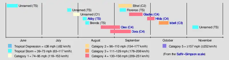 The first system, an unnamed tropical storm, developed on June 2.[3] It struck Florida as a tropical depression and then strengthened into a tropical storm while out at sea. The storm ceased to exist on June 11. Thereafter, the season went dormant for nearly seven weeks, as the next cyclone, another unnamed storm, did not form until July 23. This would be followed by the development of a third unnamed system on July 28. Tropical cyclogenesis increased in August, which had four tropical cyclones, Abby, Brenda, Cleo, and Dora. The strongest storm of the season, Cleo, peaked with maximum sustained winds of 150 mph (240 km/h) and a minimum barometric pressure of 938 mbar (27.7 inHg). Four additional storms originated in September, including Ethel, Florence, Gladys, and Hilda. Hurricane Isbell was the sole tropical cyclone to form in the month of October. The final system, another unnamed storm, existed developed on November 5 and dissipated on November 10.[3]