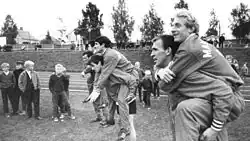 Manchester United players during their preseason tour in Finland, 21 September 1965. In front Paddy Crerand carries Denis Law; middle George Best carries Tony Dunne; at back Noel Cantwell carries Pat Dunne.
