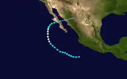 After it was upgraded, Kirsten swept the Baja California Peninsula, mainly Baja California Sur. Kirsten made landfall again about halfway between Los Mochis and Ciudad Obregón, Mexico. Kirsten weakened, but maintained tropical storm status before making landfall in Sinaloa.[9] While making landfall, Kirsten made extensive damage in the peninsula. The winds of Kirsten were up to 50 knots (58 mph) while making landfall.[10][11] Kirsten degenerated into a remnant low on September 28 and dissipated on September 29 near Navojoa.[9]