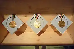 The gold medals of Jean-Claude Killy during the exhibition celebrating the fiftieth anniversary of the Games at the Musée dauphinois.