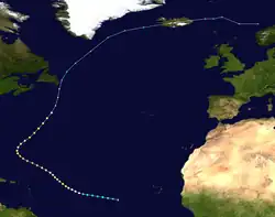 Moving northwestward, Debbie began re-intensifying on August 19, becoming Category 3 hurricane with winds of 115 mph (185 km/h) by 18:00 UTC. By 00:00 UTC on August 20, Debbie peaked with winds of 125 mph (201 km/h), which it maintained for a full day. The storm's minimum barometric pressure of 950 mbar (28 inHg) was measured by hurricane hunters during this timeframe.[2] Debbie curved northeastward as Hurricane Camille moved offshore the East Coast of the United States, weakening to a Category 2 hurricane early on August 21.[2] Gradually losing strength, Debbie passed well to the southeast of Bermuda,[16] although it is believed that if not for the presence of nearby Hurricane Camille, which emerged into the Atlantic from the United States on August 20, Debbie would have likely ended up further west, closer to the island.[17] Debbie accelerated and fell to below Category 2 intensity by 12:00 UTC on August 23. Six hours later Debbie became extratropical while still bearing hurricane-force winds, shortly before passing just offshore Newfoundland. The remnants of Debbie turned northeastward and deteriorated to gale strength late on August 24. About three days later, Debbie's remnants dissipated about 225 mi (362 km) east-northeast of Cape Farewell, Greenland.[2] In Newfoundland, wind gusts up to 85 mph (137 km/h) were observed in St. John's, while rainfall up to 0.98 in (25 mm) was recorded along the Avalon and Bonavista peninsulas.[18] The remnants of Debbie began to lose definition as they accelerated northeastward,[19] while moving over increasingly cold waters. Debbie's remnants finally dissipated west of Norway on August 27.[20][21][22]
