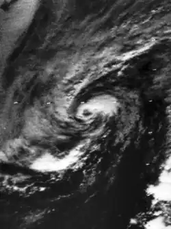 A subtropical depression developed about 970 mi (1,560 km) east-northeast of Bermuda at 12:00 UTC on October 20. After intensifying into a subtropical storm early the following day, further strengthening was slow. Initially, the system northeastward, but curved southeastward on October 24. During that time, it began acquiring characteristics of a tropical cyclone, transitioning into a tropical storm at 12:00 UTC. The storm resumed its northeastward motion and continued to intensify. Early on October 27, the storm strengthened into a hurricane.[3] based on a report of winds of 75 mph (120 km/h) from the Pretoria several hours later. At the time of hurricane intensity, it is likely that the hurricane-force wind field was only 6 mi (9.7 km) in radius and its tropical storm force wind field was only 69 mi (111 km) in diameter.[1] By 12:00 UTC on October 27, the cyclone weakened to a tropical storm and began accelerating. About 24 hours later, the system transitioned into an extratropical cyclone while situated approximately 500 mi (800 km) north-northeast of Graciosa in the Azores.[3]