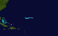 A tropical wave exited the coast of Africa on August 29 and progressed westward, with associated thunderstorms evident on satellite imagery. The system's structure organized, evolving into a tropical depression by September 3. A trough to its north steered the nascent depression northward. Despite the presence of wind shear, the depression intensified as its area of thunderstorms expanded. On September 5, the Hurricane Hunters flew into the system and estimated sustained winds of 45 mph (75 km/h), making it a tropical storm. The continued shear displaced the thunderstorms to the east of the center, as the circulation began moving to the west-southwest. On September 7, the storm weakened back to a tropical depression. On September 11, it passed north of the Lesser Antilles, still as a weak depression. After passing north of Puerto Rico, the depression dissipated on September 13 north of Hispaniola. The remnants continued westward without developing.[21]