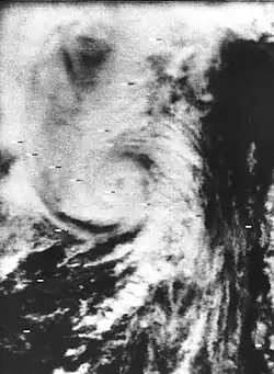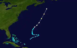 On October 11, 1970, satellite images indicated that a tropical depression developed north of Hispaniola.[1] However, according to post-analysis, a subtropical depression actually formed on October 12 at 1200 UTC. The depression slowly intensified over the next few days, and became a subtropical storm on October 12, thought this was operationally unnoticed by the National Hurricane Center.[2] By October 13, satellite imagery indicated that convection associated with the depression merged with a weak stationary front. As a result, the National Hurricane Center no longer considered it purely tropical and classified the system as a "subtropic storm" on October 14.[1] Later that day, the National Hurricane Center began issuing special bulletins for the storm, indicating the possibility of the system acquiring tropical characteristics.[3]