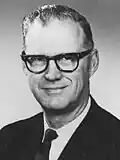 Lougheed was subsequently elected to the legislature in Calgary-West garnering 62 per cent of the vote, and the Progressive Conservatives captured 26 per cent of the vote province-wide with five other successful candidates.[3] With six elected MLAs, Lougheed became Leader of the Opposition. The group of elected Conservatives known as the "original six" included Calgary MLAs Len Werry and David Russell, Edmonton area MLAs Lou Hyndman and Don Getty, and the party's only rural candidate and former federal Member of Parliament Hugh Horner.[4] The Edmonton Journal remarked positively on Lougheed's success following the 1967 election, stating Albertans had a responsible and credible alternative as opposition.[4]