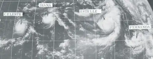A swirl of thunderstorms near Clipperton Island became a tropical depression on August 15. It moved generally northwest. The depression strengthened into a tropical storm on August 16. Estelle continued to intensify, and became a hurricane on August 19. After peaking the next day, Estelle slowly weakened. It became a tropical storm on August 20 and dissipated two days later. Hurricane Estelle spent its entire life well away from inhabited land, and consequently caused no deaths or damage.[4]