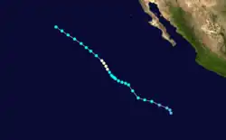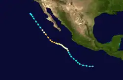 On October 18, a vortex in the Intertropical Convergence Zone was determined to be a tropical storm through the use of satellite pictures.[4] Kathleen was a tropical storm for only eighteen hours before weakening into a tropical depression and recurving to the northeast.[1] The tropical cyclone dissipated on October 19 while out to sea west of Puerto Vallarta. No deaths or damages were reported.[4]