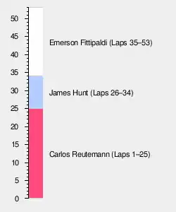 Wilson Fittipaldi crashed on lap 13, his car catching fire and requiring the fire engine to be deployed. By now, Hunt had passed Lauda and was catching the two Brabhams. Pace took the lead on lap 15, but spun on the very next lap. Reutemann having retaken the lead, was understeering badly and on lap 25 was passed by Hunt. There was a ferocious battle with Emerson Fittipaldi for the lead.